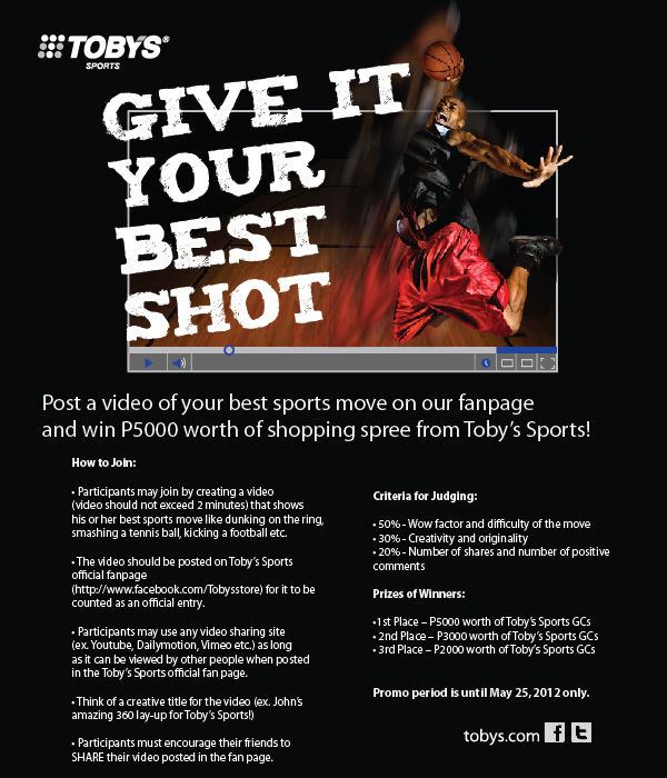 Tobysstore ) to be counted as an official entry. - Participants may use any video sharing site (ex. Youtube, Dailymotion, Vimeo etc.) as long as it can be viewed by other people when posted in Toby’s Sports official fan page.