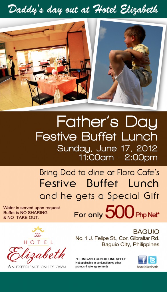 Gift Dad with a Special Treat that includes an Overnight Stay in a Deluxe Double room, Breakfast Buffet for 2 , Drink of the Month, Sunday Dinner Buffet for 2, One Complimentary Full Body Massage from Oriental Spa, Complimentary Bottle of Wine. Plus Sunday Festive Dinner Buffet for those staying at Hotel Elizabeth on June 17. All that for only Php 4,800.
